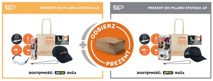Przy zakupie dowolnej pilarki akumulatorowej Klient dostaje prezent z okazji 100-lecia STIHL ! 2026 to rok, w którym marka STIHL świętuje 100-lecie istnienia. Z tej okazji przygotowaliśmy specjalną ofertę. Klienci, którzy w czasie trwania promocji kupią dowolną pilarkę akumulatorową Systemu AK lub AP otrzymają wyjątkowy prezent. Promocja trwa w okresie od 10.01. do 28.02.2026 r. lub do wyczerpania puli nagród. W przypadku zgłoszenia do Promocji zakupu promocyjnego, który obejmuje pilarkę systemu AK STIHL nagrodą jest zestaw produktów STIHL o łącznej wartości 160,00 zł składający się z: zestawu do czyszczenia i pielęgnacji pilarek łańcuchowych STIHL Care & Clean Kit MS, okularów ochronnych, czapki z daszkiem, smyczy oraz gadżetów wyprodukowanych z okazjistulecia marki STIHL (magnesu, zestawu naklejek i torby płóciennej). W przypadku zgłoszenia do Promocji zakupu promocyjnego, który obejmuje pilarkę system AP STIHL nagrodą jest zestaw produktów STIHL o łącznej wartości 240,00 zł brutto składający się z: zestawu do czyszczenia i pielęgnacji pilarek łańcuchowych STIHL Care & Clean Kit MS Plus, czapki z daszkiem z limitowanej edycji z okazji 100-lecia STIHL, smyczy oraz gadżetów wyprodukowanych z okazji stulecia marki STIHL (magnesu, zestawu naklejek i torby płóciennej).